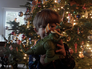 sleep walking from one room to the next. So, there on our bed, Christmas morning, the four of us waited for Hugo to awaken. We didn't wait long. He could smell presents in the air!